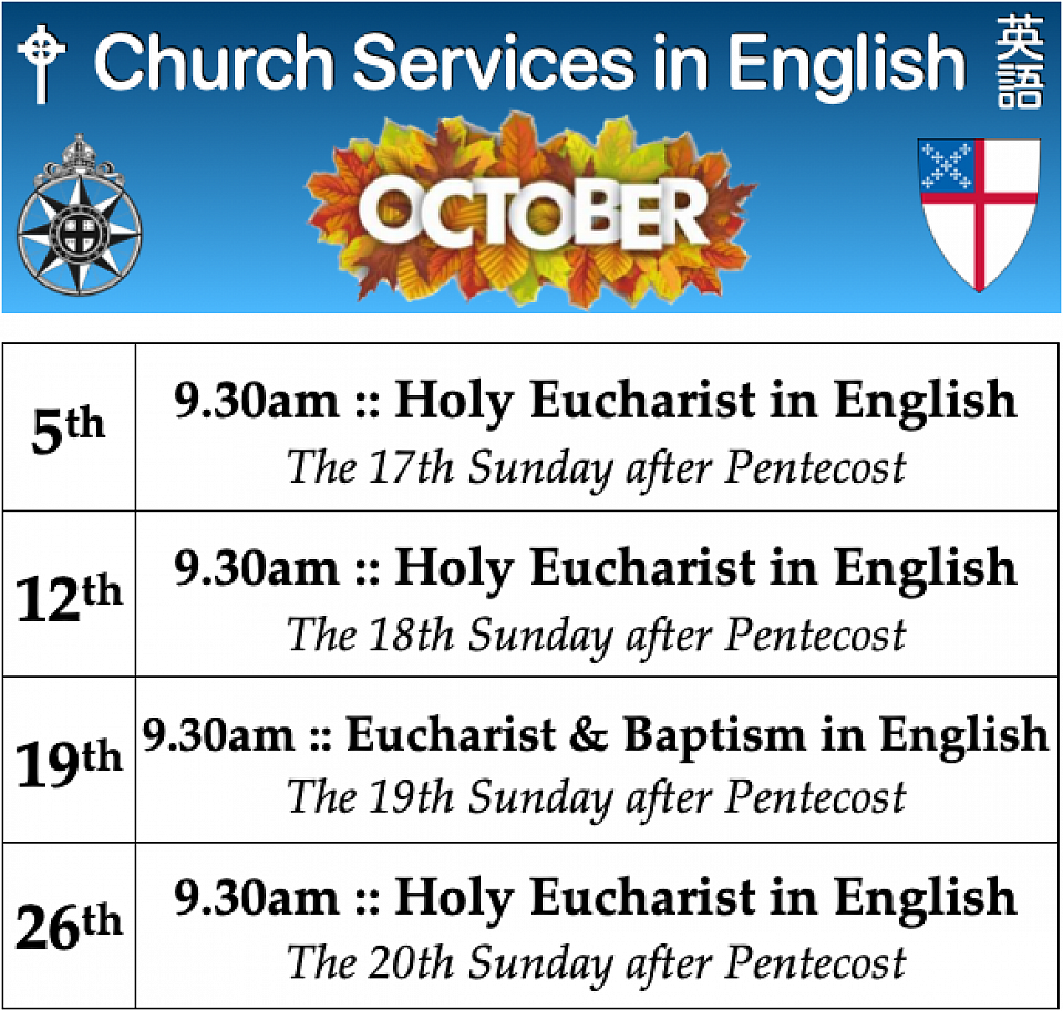 The regular time for our Sunday morning service in English is at 9.30am. The service is usually a celebration of the Holy Eucharist but may occasionally be a service of Morning Prayer.